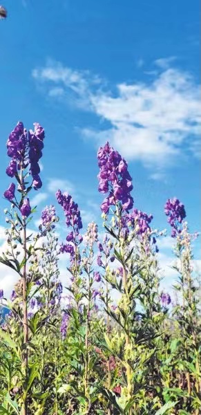 微風吹拂,相隔一條小路的不遠處,200畝附子花海在微風中搖曳,紫色的花朵點綴著深秋的布拖大地。今年的附子已經成熟,等個晴好的天氣即可采挖,到時候,地里又會呈現出熱火朝天的豐收景象,一個個附子“金坨坨”即將破土而出,村民一張張幸福的笑臉將印刻進美好時光。