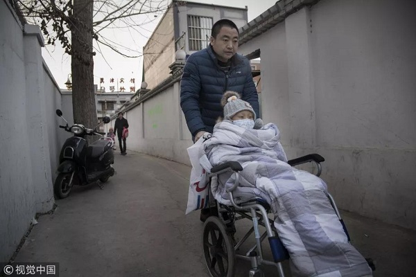 2017年12月26日,天津,爸爸推著8歲的女兒去腫瘤醫(yī)院做指血檢查/視覺中國(guó)