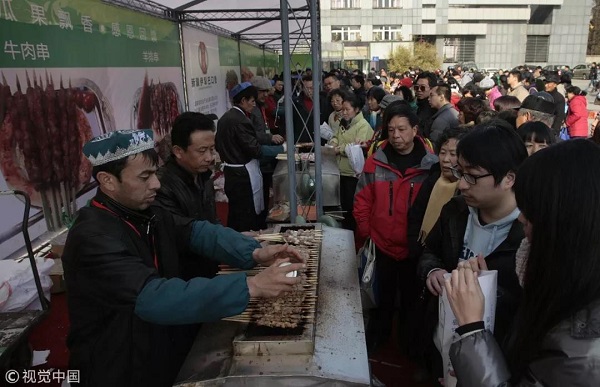 南京一家燒烤排檔上銷售的烤羊肉串吸引著消費(fèi)者品嘗/視覺中國(guó)