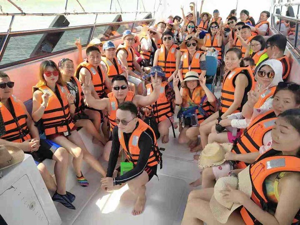 行程的重頭戲是跳海和浮潛。小伙伴們換好泳裝,登上快船出海啦,穿起救生衣,不管會不會游泳的都敢跳海。太陽當空照,我在海中泡。海水真的好咸,雖然天氣很熱,但泡在海水里溫度剛剛好,但久了鹽會滲進皮膚,有痛感,所以不宜多泡,泡久了可能就成“臘肉”了。下午的浮潛讓我很難忘,不是因為美景,而是因為我的手機也跟著一起泡進了海水,完全報廢。但這也影響不了我的好心情,海底世界的寬闊廣袤、豐富多彩,讓人飄著飄著就忘記了時間。雖然有手機“壯烈犧牲”的小插曲,但也滿足了我這個“海外”人士對海的絕大部分期望。